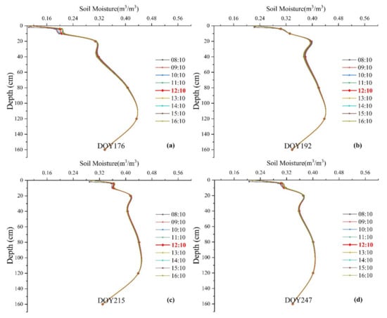 Soil moisture profiles at Daman superstation (S15) from 8:10 a.m. to 4:10 p.m. on DOY 176, 192, 215, and 247 in 2012. (a) DOY 176 in June, (b) DOY 192 in July, (c) DOY 215 in August, and (d) DOY 247 in September. The red bolded line represents the local overpass time for ASTER.