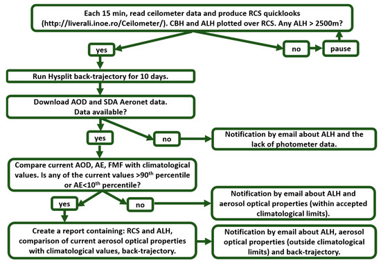 The steps followed in the methodology proposed are presented in Figure 1 and discussed below. In the first step, the quick looks of RCS are updated and shown on the webpage every 15 min for plots, representing the last 24 h of measurements. We superimpose the cloud base height (CBH) and the ALH over RCS images. The raw data files save 5 min measurements taken at 30 s (10 profiles) and 15 m temporal and spatial resolutions (as required for E-PROFILE). We check if we have ALH (second and third ALH recorded in the raw file) above 2500 m altitude a.g.l. in the last 15 min. The PBLH in Magurele is usually below 2500 m [76].