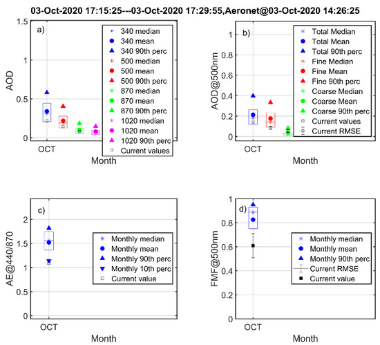 If AERONET data are available, the closest photometer measurement over the last 3 h from the time of layer detection is considered. The variables described in Section 2.2. are analysed. The current values of AOD at 340 nm, 500 nm, 870 nm and 1020 nm, AE440/870, FMF, FMAOD and CMAOD at 550 nm are compared with the climatological values at our station [67]. This climatology was constructed using all the available data for each month over the ten years period. The comparison with the climatological values is performed as following. If any of the variables exceed 90th percentile or AE is bellow 10th percentile, the aerosol layer is assumed to be outside the climatological limits while it is labelled as high pollution and it will be closely monitored. If neither of the values are above 90th percentile nor the AE is below 10th percentile, an email is sent to notify about the presence of the ALH with the mention that the values are within the climatological limits. We chose to use percentiles over mean and standard deviation in order to have a better representation of our sample, considering that AOD and AE values do not follow normal distributions. The 90th percentile for the characterization of extreme AOD was selected so as to be consistent with other studies (e.g., [77,78,79]). The criteria defining the values of the current variables ‘outside the climatological limits’ are summarized in Table 1. If at least one of them occurs, the warning is issued stating that the current measurement is “outside climatological limits”.