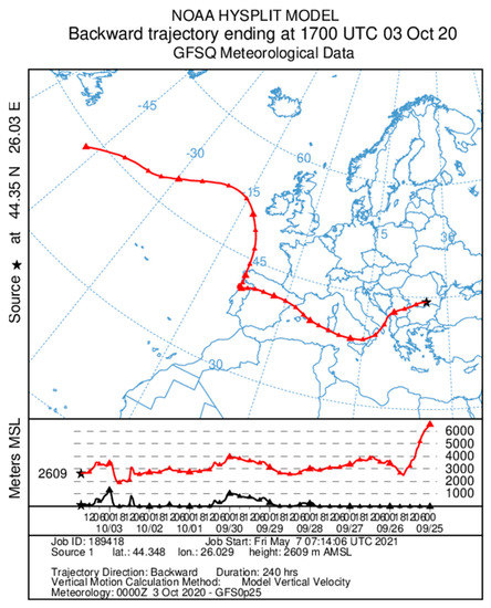 The HYSPLIT back-trajectory model [75] is used to identify the possible source of the aerosol pollution layers. The input data in the model represent the ALH provided by ceilometer. The simulations are based on GFS0.25 meteorological data (since June 2019), while lower resolution data (e.g., GDAS0.5 or GDAS1) are used in case the former are not available. One backward trajectory is calculated for each detected aerosol layer (ASL) for a backward run time of 240 h. The 10-day period was selected in line with what the community uses in order to identify the source of long-range transported aerosol layers [25,26]. All the output meteorological variables are saved in text files for further processing.