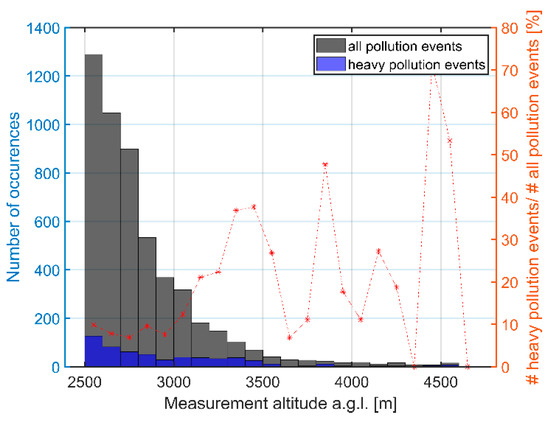 Histogram of the measurement altitude. The right axis shows the percentage of the heavy pollution events with regard to the total number of events for each bin size.