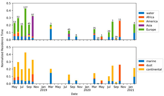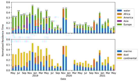 Normalized residence time over continents (upper plot) and the associated aerosol type (lower plot). The numbers on top of the bars represent the number of cases for each month. Water stands for sea and/or ocean.
