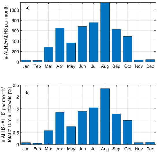 A representation of the total number of cloud-free intervals over the three years (Figure 9) shows that, in the large majority of the cases, ALH2 and ALH3 lay below 2500 m, especially during winter months. This is a clear indication that the presence of the low-level clouds or fog during the winter time is not the main reason why a small number of events were recorded; however, the cloud coverage over Magurele is indeed higher during these months [84] and an increased number of fog events is observed [85]. However, during winter, the PBLH can be much lower than the threshold of 2500 m; thus, many layers above PBL are missed. In Section 3.4, we discuss the ALH occurrences below 2500 m with respect to the PBLH.