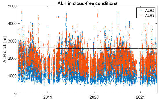 Number of ALH2 and ALH3 in cloud-free conditions over the entire three-year period. The black horizontal line shows an altitude of 2500 m a.g.l., which is the lower limit for our algorithm.