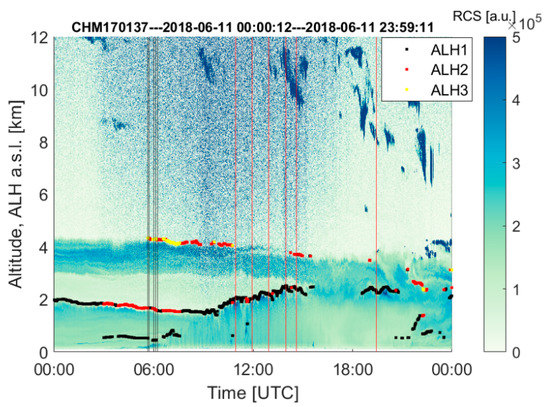 RCS for 11 June 2018 with overlaps of ALH. The vertical black lines delimitate the middle of 15 min intervals where warnings were automatically issued from our algorithm, while the vertical red line shows the middle of a ~1 h measurement interval by lidar.