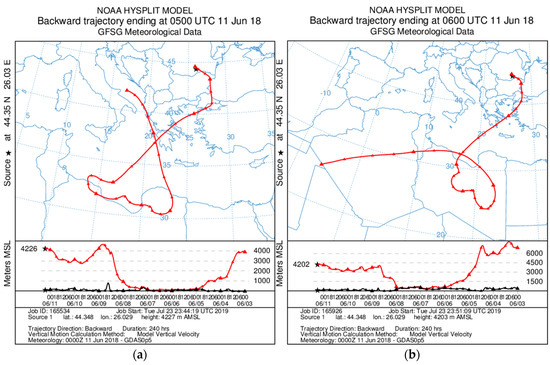 Air mass back-trajectory for layers at ~4200 m, with staring times at 05:00 UTC (a) and 06:00 UTC (b).