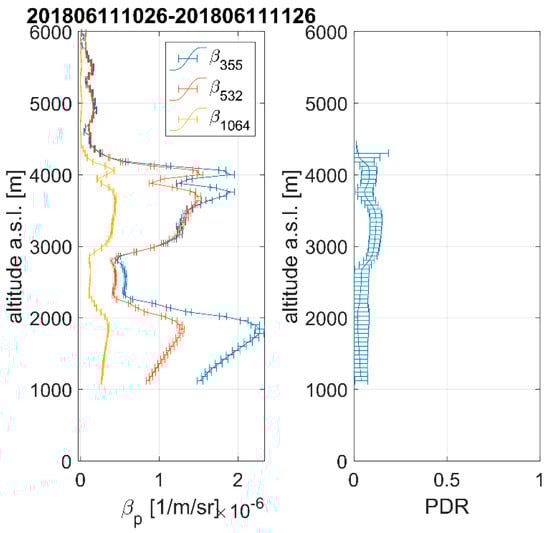 The back-trajectories show air masses passing over North Africa with a higher residence time (see the values below) for the trajectories corresponding to the third, fourth, and fifth warnings. Figure 12 shows two back-trajectories, corresponding to the starting time at 05:00 and 06:00 UTC for a layer at altitude of ~4200 m. The air mass residence time, based on Radenz’s procedure for the five back-trajectories, is: (I) 0.36, 0.16, and 0.01; (II) 0.29 0.17, and 0.01; (III) 0.1, 0.37, and 0.004; (IV) 0.01, 0.30, and 0; and (V) 0.05, 0.49, and 0 for the marine, dust, and continental aerosol types, respectively. Thus, based on the origin of the airmasses, we observe a mixture of dust and marine (while the continental contribution is much smaller) with a higher dust contribution for the last three cases. When lidar measurements of depolarization and lidar ratio are available, one can estimate the contribution of marine and dust (see [87], Table 3). Figure 13 and Figure 14 show the lidar measurements taken during 11 June 2018, over the 11:26–12:27 UTC and 19:00–19:30 UTC periods. During day time, the Raman measurements are not available. For the measurements during day, we evaluated the following mean values for the 3000–4000 m layer (2500–3500 m for night time), as shown in Table 2: the backscatter Angstrom exponent (BAE) between 355 nm and 532, the backscatter Angstrom exponent between 532 nm and 1064 nm, and the particle linear depolarization ratio (PDR). When Raman measurements are available (night-time), we calculated in addition the extinction Angstrom exponent (EAE) and the lidar ratios (LRs) at 355 nm and 532 nm. According to Papayannis et al. [88], which studied the Saharan dust through EARLIENT measurements, BAE values for the ratio 532/1064 are found between −0.5 and 3, while PDR values range from 10% to 25%. LRs at 532 nm are found between 20 and 100 sr. Gross et al. [87] found depolarization values as high as 32 ± 2%. Typical dust values for EAE (literature research, measured), shown in a study by Nicolae et al. ([89], Table 6), range between −0.15 and 2.5.