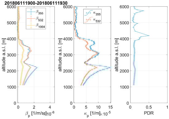 Lidar measurements around 19:15 UTC: particle backscatter coefficient for 355, 532, and 1064 nm (left); particle extinction coefficient for 355 and 532 nm (middle); and particle linear depolarization ratio at 532 nm (right).