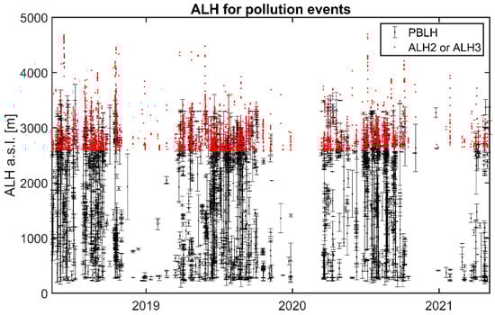 Another issue that could affect the quality of the current version of the system is the fact that we used a predefined threshold of 2500 m for the free troposphere layers. The choice of this altitude was based on the fact that, generally, PBLH is below this altitude at our site and ALH1 is the top of PBLH in most cases. However, this could impact in missing some layers below 2500 m when the PBLH is significantly lower, especially during the winter time. To assess the impact of the predefined altitude, an off-line process to calculate the PBLH (which includes the residual layer) was run for all our events. Figure 15 shows the retrieval of the PBLH following the methodology developed by Wang et al. [90]. PBLH was determined as an average over 30 min (48 values daily). ALH2 and ALH3 used in this analysis are also shown. Thus, in over 5150 common cases (over 431 days), i.e., 12.2% of cases, ALH2 and ALH3 lied below PBLH. If we consider all 30 min intervals for each of the 431 days (when we had notifications) (not shown here), we found that ALH2 (ALH3) lied below 2500 m in 65% of (36%) cases. Comparing with PBLH, we found that 24% (10%) of ALH2 (ALH3) is below PBLH. The percentages for ALH2 (ALH3) lying between PBLH and 2500 m are 42% (27%).
