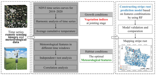 In this study, the prediction model for wheat stripe rust was constructed in three steps (Figure 2). First, we estimated the wheat phenology (jointing date) based on time-series remote sensing images and meteorological data using the harmonic analysis of time-series combined with average cumulative temperature and extracted vegetation indices based on the estimation results to characterize wheat growth conditions. Then, meteorological features sensitive to stripe rust were screened as habitat conditions by correlation analysis combined with independent t-test analysis. Finally, the phenological information-based vegetation indices and meteorological features were used as model inputs, and a prediction model for wheat stripe rust was constructed using the random forest (RF) method.