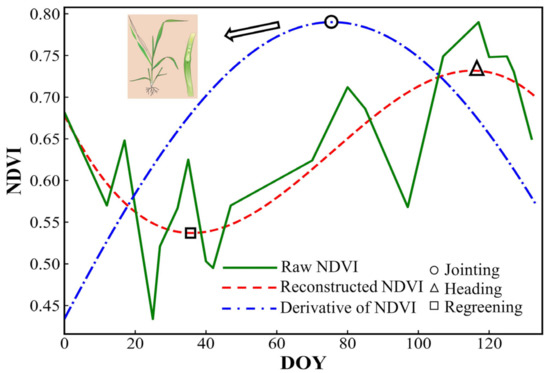 Figure 3. Extraction of Day of Year (DOY) of regreening and jointing date according to the NDVI time-series curve. The green solid line indicates the raw NDVI time-series curve. The red dotted line indicates the reconstructed NDVI time-series curve. The blue dotted line indicates the first-order derivative of the NDVI time-series curve. The square indicates the regreening date. The circle indicates the jointing date and the triangle indicates the heading date. - iii.