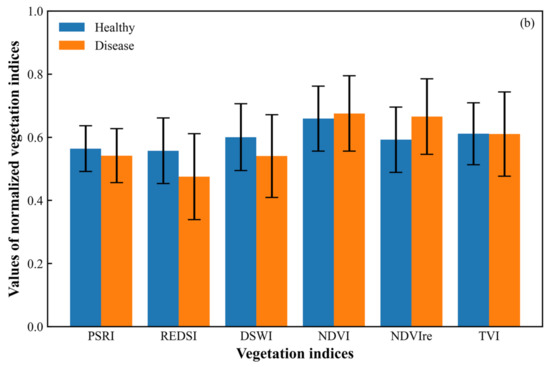 The mean and standard deviation of normalized vegetation indices. (a) Phenological information-based vegetation indices; and (b) single-date image-based vegetation indices. Blue bars indicate the mean values of healthy samples, orange bars indicate the mean values of stripe-rust-infected samples and error bars indicate the standard deviation.