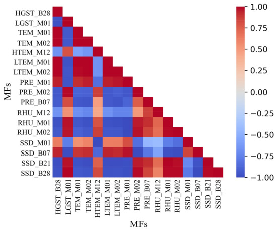 To further reduce the redundancy between the 17 meteorological features mentioned above, the correlation coefficient (R) between the meteorological features was calculated using correlation analysis (Figure 8). The results show that there was a high redundancy between the features. Among them, there were high correlations among ATEM, PRE and RHU in the same time windows. There were high positive correlations between TEM_M01 and PRE_M01 and high negative correlations with RHU_M01 TEM_M02, PRE_M02 and RHU_M01. An absolute value of R greater than 0.9 was used as the threshold, and four meteorological features sensitive to stripe rust were finally screened, namely, average relative humidity in December (RHU_M12), average sunshine hours in January (SSD_M01), average precipitation in January (PRE_M01) and average precipitation 7 days before the field survey date (PRE_B07).