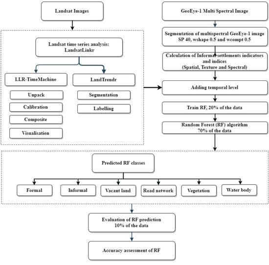 Flow chart for informal settlement identification in Jeddah using an object-based random forest approach that incorporates data from the LandsatLinkr.