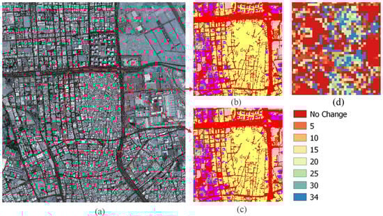 The main difference between formal and informal road networks. (a) A GeoEye-1 image (b) shows mapping results without TSA, while (c) shows the mapping results using TSA. The result shows an improvement in the connectivity of road network and enhancing road widths. (d) The year-of-change results inside an informal settlement.