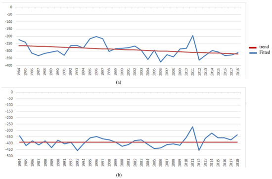 Annual composite of chosen class from 1984 to 2018. (a) A TCA trajectory of the formal area. (b) A TCA trajectory of an informal settlement representing changes.