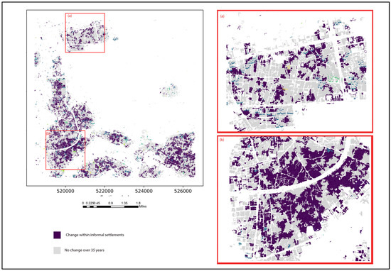 The performance of the indicators at the environment level was less relevant and scored lower than the indicators at the settlement and object levels, with a relative relevance ranging from 4% to 12%. The distribution of informal settlements occurs frequently outside of city centres [24,46]. This was not always the case, however. As a result, the proximity indicator showed a lack of descriptive capabilities. Moreover, DEM had the least effect on the classification at the environ level, with a relative importance of less than 5%. Since the terrain was almost flat, the formal and informal settlements were found to be equally subject to flood hazards. When informal areas are located along river banks or on steep slopes, the terrain can be highly useful for detecting them [23]. Figure 11 shows the temporal characteristics of the areas classified as informal settlements within the study area. The purple shows the changes in dwellings occurring inside informal settlements. The grey represents the areas that experienced no changes over 35 years.