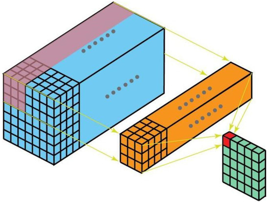 Modified on the basis of a 2D CNN, a 3D CNN [39,70] is mainly applied in video classification, action recognition, and other fields and can perform simultaneous convolution operations in three directions—height, width, and depth—for HSIs without undergoing dimension reduction processing (Figure 1), which can immediately extract spatial–spectral joint high-order features and make full use of spatial–spectral correlation information.