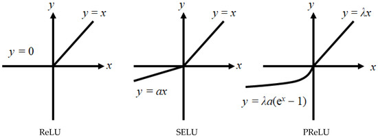 Since the gradient of the activation function (Figure 3) of the rectified linear unit (ReLU) [71] is always 0 when the input is a negative value, the ReLU neurons will not be activated after parameters are updated, leading to the “death” of some neurons during the training process.
