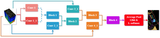 Figure 4 displays the overall process of the HSI classification framework of the MSLN. It can be seen from this figure that the multi-shortcut-link network’s structure is bridged to four residual blocks (Figure 6) for a total of four times (Figure 7); then, the last output layer of the third residual block is spliced with conv4_1 as the input tensor for the first layer of the fourth residual block; after the fourth residual block is processed, the global self-adaptive average pooling downsampling is used to expand the output tensor into one-dimensional vectors via the fully connected layer to map the learned distributed features into the space of sample labels; finally, the large-softmax loss function is used for classification.