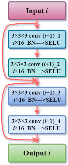 With the deepening of network layers, a 3D CNN is prone to gradient dispersion or gradient explosion. Proper use of regularity initialization and the intermediate regularization layer can deepen the network, but the training set accuracy will be saturated or even decreased. A ResNet [56] alleviates the gradient disappearance problem that occurs in deep neural networks by skipping a connection in the hidden layer.