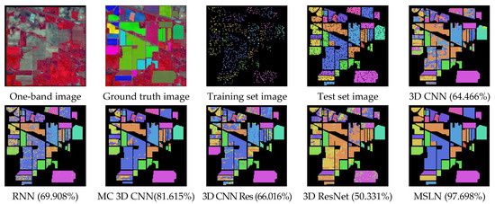 The IP dataset was acquired using AVIRIS sensors on the test site in Indiana in 1996 with an image resolution of 145 × 145 pixels, a spectral range of 0.4–2.45 μm, and a spatial resolution of 20 m. There remained 200 effective wavebands for classification after the wavebands affected by noises and suffering severe water vapor absorption were eliminated, and a total of 16 crops were labeled. This dataset was shot in June, when some crops, such as corn and soybean, were in the early growth stage. The coverage rate of less than 5% was prone to pixel mixture, leading to a significant increase in the difficulty of vegetative terrain classification.