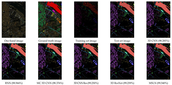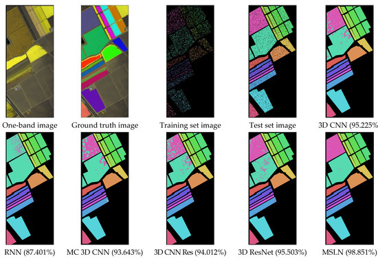 The S dataset was shot in Salinas Valley, California, using AVIRIS sensors with an image resolution of 512 × 217 pixels, a spectral range of 0.43–0.86 μm, and a spatial resolution of 3.7 m. There remained 204 effective wavebands for classification after the wavebands affected by noises and suffering severe water vapor absorption were eliminated, and a total of 16 crops were labeled, covering vegetables, bare soils, vineyards, etc.