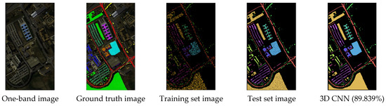 A CNN is a feed-forward neural network with a deep structure that includes convolution computation and is one of the most representative algorithms for deep learning. It usually comprises an input layer, a convolution layer, a pooling layer, a fully connected layer, and an output layer. Combining the properties of local connection and weight sharing, it can go through the end-to-end processing procedure, and in 2D images, it can utilize the deep network structure to solve complex classification problems, exhibiting an outstanding performance. However, for 3D data of HSIs, not only is the spatial–spectral information unable to be fully utilized but dimension reduction processing is typically required when using a 2D CNN for HSI classification. This would even add a large number of parameters, which dramatically decreases the computational efficiency and training speed, and more likely causes overfitting for HSIs with fewer labeled samples.
