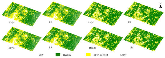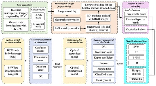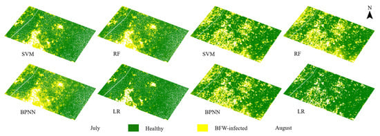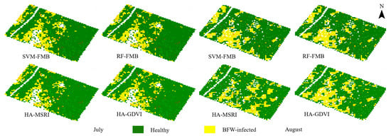 - The supervised methods and unsupervised method (HA) yielded similar OAs of more than 95% in pixel-scale and similar distribution maps. Comprehensively considering the results of the classified areas and the plant-based OAs, the unsupervised method HA was recommended for BFW recognition due to its balance performance on accuracy and speed, especially in the late stage of infection; the supervised method RF was recommended in the early stage of infection to reach slightly higher accuracy.