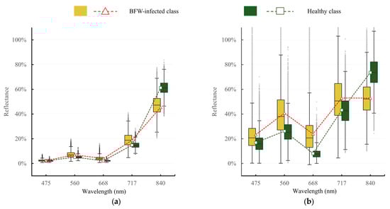 - BFW disease expressed obvious difference in red and NIR band, moderate difference in green band, and small difference in blue and RE band; the BFW-infected canopies had higher reflectance in the visible region, but lower reflectance in the NIR region. The VIs derived from the red, NIR, and green band showed significant difference between the BFW-infected class and the healthy class.