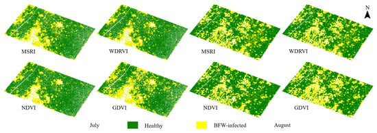 | NDVI | BFW-infected | 99.96 | 93.33 | 96.61 | 0.93 | 98.40 | 92.67 | 95.55 | 0.91 | |