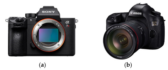 (a) Sony A7R series cameras. They have a similar appearance; (b) The appearance of a Canon 5DS camera.