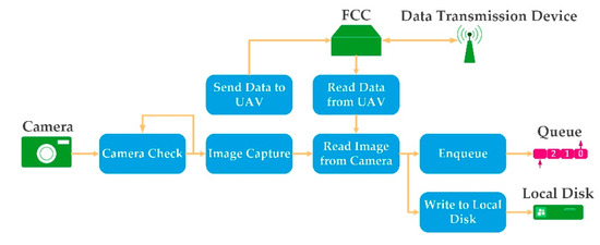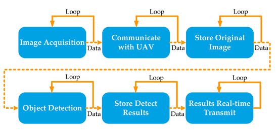 The whole software system can be divided into six modules to run in parallel, as shown in Figure 13. For the image acquisition subsystem, the Image Acquisition module contains three steps of Camera Check, Image Capture, and Read Image from Camera; the Communicate with UAV module contains two steps of Read Data from UAV and Send Data to UAV; and the Store Original Image module contains two steps of Write to Local Disk and Enqueue. For the object detection subsystem, the Object Detection module contains two steps of Dequeue and Object Detection; the Store Detect Results module contains two steps of Calculate Object’s Location and Write to Local Disk; and the Results Real-time Transmit module contains one step of Transmit to the Ground.