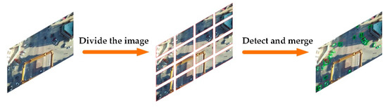 Figure 10. The aerial image is first divided into small images of equal size with overlap for detection and then merged after all of the detection is completed. - Calculate Object’s Location. The image acquisition subsystem has recorded a geographic coordinate for each image. However, this coordinate is only the location of the UAV at the moment the camera is triggered, not the suspected object (Figure 11a). Moreover, the attitude of the UAV when the camera is triggered will also cause the tilt and rotation of the image, which increases the complexity of the problem (Figure 11b). The height and width of each image usually represent the actual distance of hundreds of meters. If a large attitude accompanies the UAV at this time, the offset of the object may even reach more than 1 km, which significantly impacts the object’s positioning.