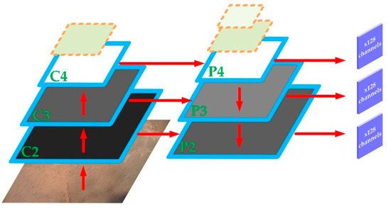 - Remove High-level Feature Maps. High-level feature maps have a larger receptive field. Since the objects in the aerial image are mainly medium-sized (pixel size is between 322 and 962, COCO metrics), a situation in which the object occupies a large area of the image will hardly appear, so we try to remove some high-level feature maps. When the feature pyramid network (FPN) [40] is used as the neck of the model, only three low-level feature maps are retained, as shown in Figure 14. We also discussed the popular YOLOv5 algorithm with a different structure. The YOLOv5 algorithm has three detection heads with a stride of 8, 16, and 32 respectively, and the head of a stride 32 (P5) is removed for experimentation. The smaller S model (YOLOv5s) was selected as the benchmark, and the simplified version of YOLOv5s are shown in Figure 15.