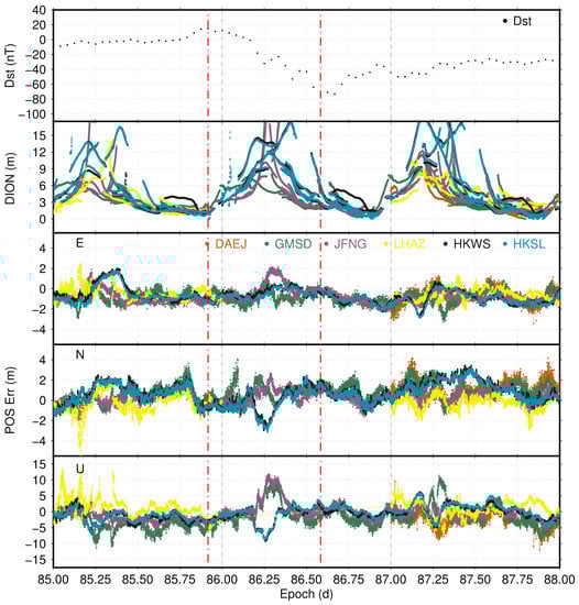 It is worth noting that there were some sharp increases in the positioning errors of the LHAZ station in the E, N and U directions during the main phase of the storm. Nonetheless, there were no similar increases observed for the HKWS and HKSL stations, which are also located at lower latitudes. The DIONs shown in Figure 2 stayed at a low level, thus suggesting that the correction of ionospheric error could be sufficient. The increases were observed at nearly 1 LT and lasted for about 30 min, thus indicating that this occurred locally and temporarily. The time series of F10.7 cm radio flux was also checked for the same period to discover whether there could be sudden ionospheric disturbances. However, no sudden variations were observed and the values were under 75 sfu (1 sfu = 10 w/m/hz), thus implying that there were no abrupt changes in solar activity. Solar radio burst (SRB) events can also affect GNSS positioning [22] and, therefore, the data from the NOAA websites (see ftp://ftp.swpc.noaa.gov/pub/indices/events, accessed on 20 January 2022) were checked to detect any possible occurrences of SRB events. It was noticed that no SRB events occurred during that epoch.