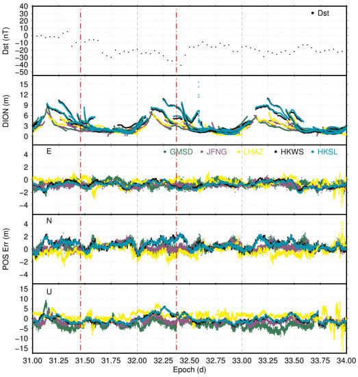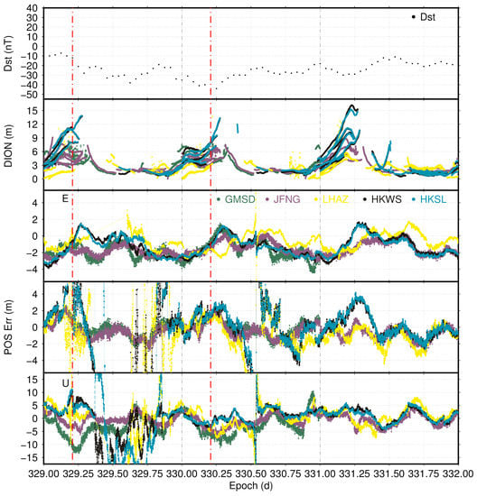 From Table 6, we can see that the positioning errors during weak storms were generally lower than those observed during moderate and strong storms. However, it can be noticed from Table 6 that the LHAZ, HKWS and HKSL stations presented an irregular behavior on MJD 57717 (DOY 329, 2016). Among the three stations, the maximum positioning error reached 50.08 m in the N direction of HKSL, while the minimum reached −93.21 m in the N direction of HKWS. The corresponding bias and RMSE were also large. There were no such big changes for the GMSD and JFNG stations, although they lie in higher latitudes. The reasons for this irregular behavior in the positioning errors of the three stations are analyzed in details later. Except for the anomalous results, the maximum was up to 10 m, the minimum was −20 m, bias was approximately 3 m and the RMSE could reach 2.15, 1.95 and 4.87 m for the E, N and U directions, respectively.