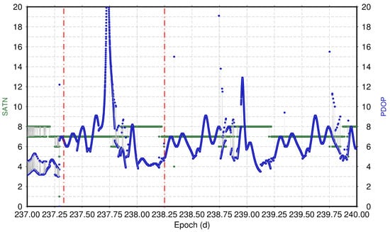 The number of satellites and the PDOP for the LHAZ station during a strong storm around DOY 238, 2018. The green dots indicate the number of satellites and the blue dots indicate the PDOP. The red dash–dot lines indicate the borders of the main phase, the left-hand line is the start epoch and the right-hand line is the end epoch. The gray dash–dot lines indicate the borders of the days. The X-axis is epoch (DOY) in GPST, the left Y-axis is the number of satellites and the right Y-axis is PDOP.