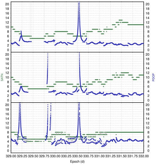Further, BKG Ntrip Client (BNC) software [23] was used for the data quality check at the LHAZ station. The number of satellites and the position dilution of precision (PDOP) were computed and are shown in Figure 5. It was found that there were no variations in the number of satellites during the periods that sharp increases in the PDOP values were observed. This indicates that the degradation was directly caused by the poor geometrical structure of the constellations. The orbits of most of the observed satellites were geostationary earth orbits (GEOs) and inclined geosynchronous orbits (IGSOs). There was only one medium earth orbit (MEO) satellite, named C14, which was at a high elevation during this time. These factors might have contributed to the sharp jumps in the PDOP. However, frequent jumps in the number of satellites were observed near the end of the whole jump period. On checking the PDOP values at other stations, no such jumps were observed in the same period. The reason for this could be attributed to receiver signal tracking issues during the storm. In addition, it can be seen that the PDOP values varied and most values were greater than 5 during the whole storm period, thus suggesting that the influence of this storm on PDOP was strong.