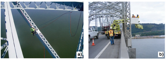 Examples of bridge inspections based on visual checking. (a) An inspector conducting a rope re-belay to obtain hands on access for close up inspection. (Creative Commons “SR 433, Lewis and Clark Bridge Inspection” by Washington State Dept of Transportation is licensed under CC BY-NC-ND 2.0) and (b) The UBIT (Under Bridge Inspection Truck) deploys its arm and bucket whit traffic disruption. (Creative Commons “Lewis & Clark Bridge Inspection—22 July 2008” by Washington State Dept of Transportation is licensed under CC BY-NC-ND 2.0).