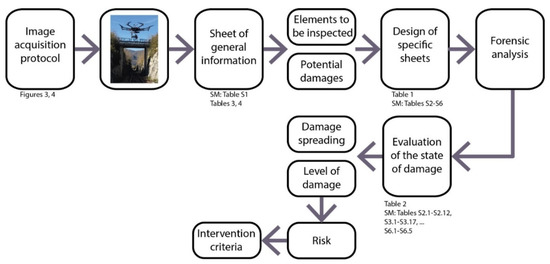 The proposed methodology is simple and systematized to make both the workflow and the decision-making process easier. To make this possible, the construction elements and the type of damage were grouped. Moreover, a level scale of only three levels was used for defining the intervention criterion (i.e., damage spreading, level of damage and risk). These intervention criteria or final recommendations were reduced to three options. The adoption of this criterion has yielded a process that is both understandable and easily reproducible.