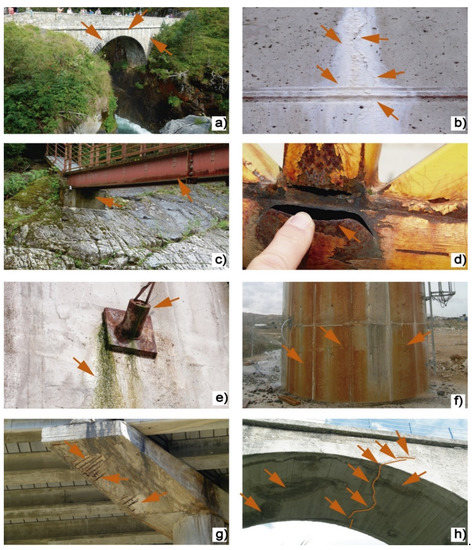 Figure 3. Some common damages that can affect bridges: (a) efflorescences on a masonry bridge in Cauterets, France; (b) efflorescences and crack in a reinforced concrete wall; (c) lichen growth in abutment and corrosion of a steel bridge beam in Lanuza, Spain; (d) crack and corrosion in steel truss handrail in Alcoy, Spain; (e) lichen growth caused by excessive humidity and corrosion in cable anchor plate in abutment in Benidorm, Spain, (f), rust stains in a surge chamber; (g) concrete spalling due to corrosion of steel reinforcement in a bridge in Petrer, Spain; (h) transverse cracks on reinforced concrete arch of bridge in Alcoy, Spain. - Lichen growth occurs when a stone-like material (masonry, concrete, bricks, etc.) support exhibits an excessive humidity (Figure 3c,e).