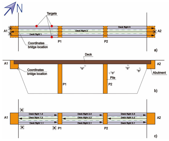 Next, the bottom part of the bridge is inspected, namely, the abutments, the piers and the basal part of the deck (ceiling of the bridge, from below the bridge). This is the reason why the selected camera needs to possess a tight angle looking up (Figure 4). First, abutment A1 is inspected, followed by the bottom part of the first deck span, with a sequence of flights like that used for the top part of the deck. This procedure is repeated for each span of the deck until reaching abutment A2 (Figure 4c).