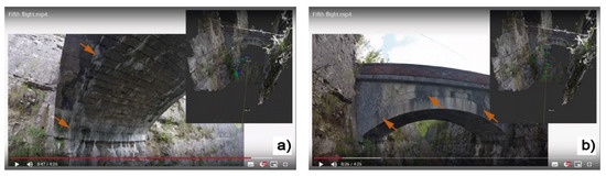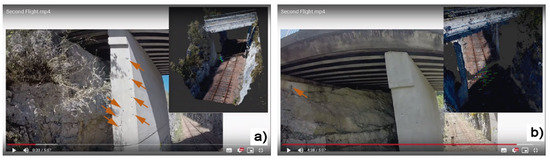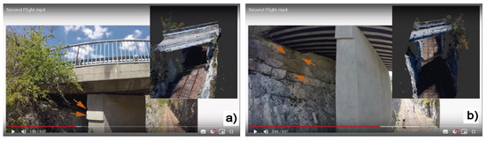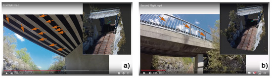 Mineral precipitations in the joints (a) and lichens growth (b) of bridge 1 pointed out by orange arrows. Note the geolocation image of the drone in the upper right corner of both frames, which allows the engineer to know the position of the displayed image in real time during the analysis of the videos.