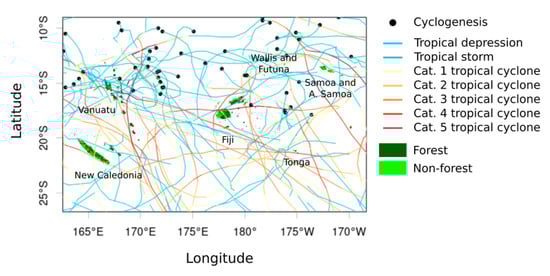 The study area encompasses 76 islands in six archipelagos (New Caledonia, Vanuatu, Fiji, Samoa, Tonga, Wallis and Futuna) located in the South West Pacific basin in longitude 152.3° E–162.5° W and latitude 10.0° S–30.0° S. Small islands, i.e., those less than 5 km long and/or wide were omitted. In this region, TCs mostly occur between November and May during austral summer []. On average, 6–8 tropical storms occur in the South West Pacific Basin between November and May with a peak of activity in February–March []. There are 2 to 5 tropical storms per decade on land for the considered islands with maximum cyclone densities west of Vanuatu and north of New Caledonia extending into the Coral Sea, between 10° S and 25° S fading off toward Samoa [].