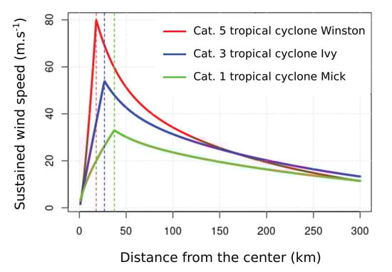 Example of 2D surface wind speed structure reconstructed using the Willoughby model (Equation (2) (f and g)) for category 1 tropical cyclone Mick (3–5 December 2009), category 3 tropical cyclone Ivy (21–28 February 2004), and category 5 tropical cyclone Winston (7 February–3 March 2016). Vertical dotted lines represent RMW, the distance r from the center of the tropical cyclone where winds reach their maximum speed (Wmax.)