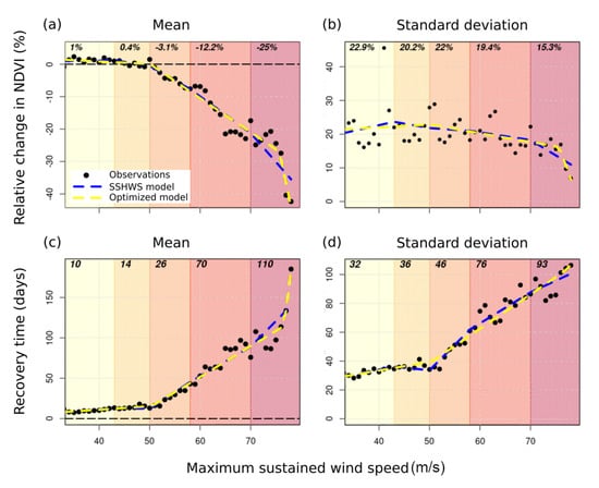 Model optimization highlighted another significant breakpoint located around 75 m.s, i.e., within the highest category of the SSHWS (that begins at 70 m/s for category 5). When this breakpoint was reached, sharp increases in both the damages caused by TCs and the recovery time were observed. These high intensity winds (>75 m/s) resulted on average in a reduction in NDVI greater than 40%. While this breakpoint relies only on a few points, it feeds the debate about updating TC intensity scales to better fit increasing TC intensity (e.g., [,]). Indeed, such extremely intense TCs occurred during the last decade and may reflect the possible intensification of these disturbances under human–induced global warming (e.g., [,]). For instance, after typhoon Haiyan (2013), one of the most intense TCs ever recorded worldwide, severely impacted the Philippines, Lin et al. [] suggested creating a new category 6 for TCs generating winds ≥ 80 m/s. However, based on the most recent analyses [], it is not clear that increased TC intensities have indeed occurred during the past 40 years (1979–2017) in the Western Pacific. On the same line, while Winston (2016) generated sustained wind speed > 80 m/s in the South Pacific, i.e, one of the strongest winds on record in the South Pacific, it remains to be explored whether such intensity records may increase in the future under global warming.