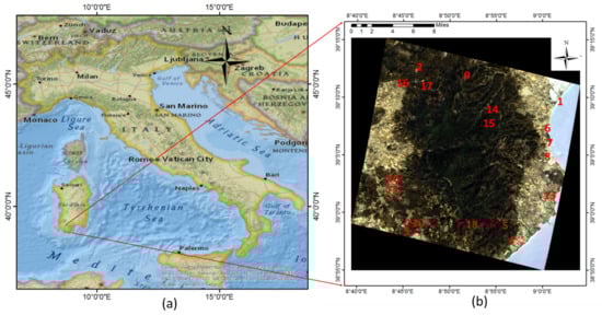 As an example, an image of 10 October 2021 on the southern part of this Mediterranean island was selected from the archived data shown in Figure 1. This image comprises Monte Arcosu Forest, one of the immense holm oak forests of the Mediterranean region, which is east of Cagliari. The region of interest is hilly with an altitude of around 800 m and a total area of 32 km2. The primary vegetation in this forest is holm oak (Quercion ilicis) and mastic shrubs of two different families (Ericion arboreae and Oleo ceratonian). The highest areas have low vegetation, specifically meadows of two different families (Teucrion mari and Periballio-Trifolion subterranei), whereas the lowest areas (around 200–300 m altitude) have evergreen broadleaved trees (Quercetalia ilicis) [24,25].
