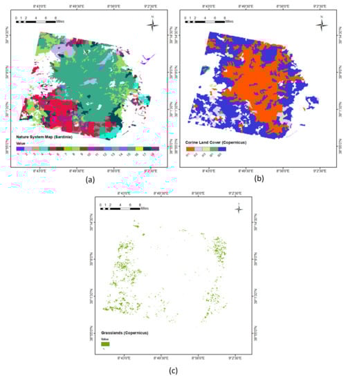 (a) Nature System map; (b) Corine land cover map; and (c) grasslands map.