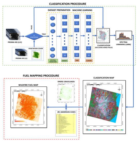 Therefore, this paper presents an automatic procedure for mapping wildfire fuel types using PRISMA hyperspectral imagery in a semisupervised machine learning approach. This work was started under the project S2IGI (an integrated system for forest fire management) funded by the Regional Administration of Sardinia under the POR (Programma Operativo Regionale) FESR (Fondo Europeo di Sviluppo Regionale) Sardinia and improved under the project ASI-HYP, funded by the Italian Space Agency. The main objectives of this work are (1) to develop an automatic procedure for wildfire fuel mapping, using PRISMA hyperspectral imagery and the land cover data from regional/national portals as input and (2) to correlate the fuel types to Anderson fuel models, more appropriately incorporating secondary classifications (sparse/dense, plains/mountains, etc.), if necessary, to extract the attributes of fuel models such as the fuel load (t/ha) for the living and dead components of the vegetation, the height of the fuel (litter) to the ground, extinction humidity (%), flame height (m), and propagation rate (m/s). In this paper, initially, the procedure developed to map fuel types using the vegetation map from the regional portal of Sardinia is presented, and the possibility of this procedure being extended to any part of Europe by using the LUCAS database as input is also explained. Section 2 describes the PRISMA data and methods used, and Section 3 describes the stepwise procedure of dataset preparation and fuel mapping. Section 4 represents and discusses the results obtained. Finally, Section 5 summarizes the conclusions of this work.